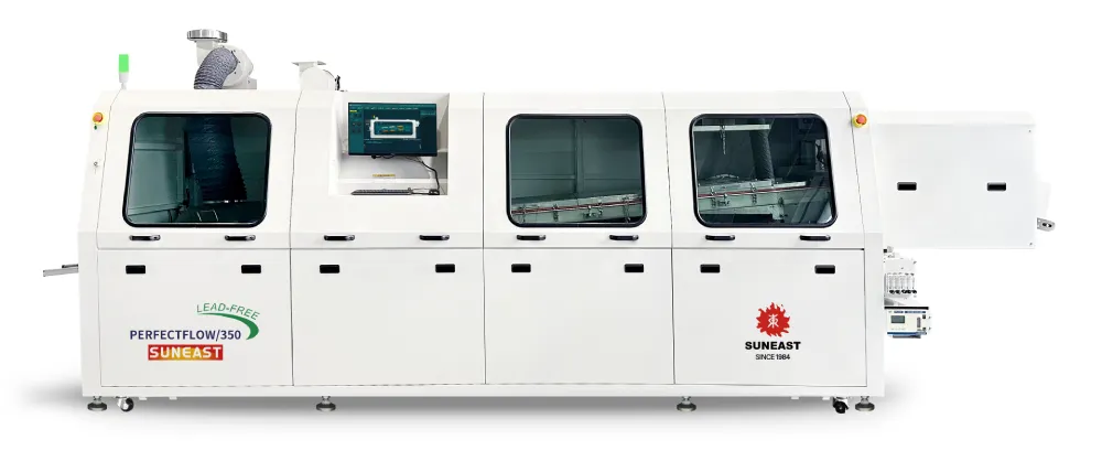日東科技PERFECTFLOW系列隧道式全程密封氮?dú)獠ǚ搴?采用全球首創(chuàng)的焊接區(qū)密封解決方案和創(chuàng)新的分段傳輸方案,解決了常規(guī)隧道式波峰焊的分段輸送卡板、調(diào)寬卡頓及使用操作維護(hù)不便等問(wèn)題。消除波峰與錫面落差大的不良影響,將波峰焊接氮?dú)獗Wo(hù)工藝的應(yīng)用效果發(fā)揮到極致,極大地提升了隧道式波峰焊設(shè)備性能和焊接工藝品質(zhì)。