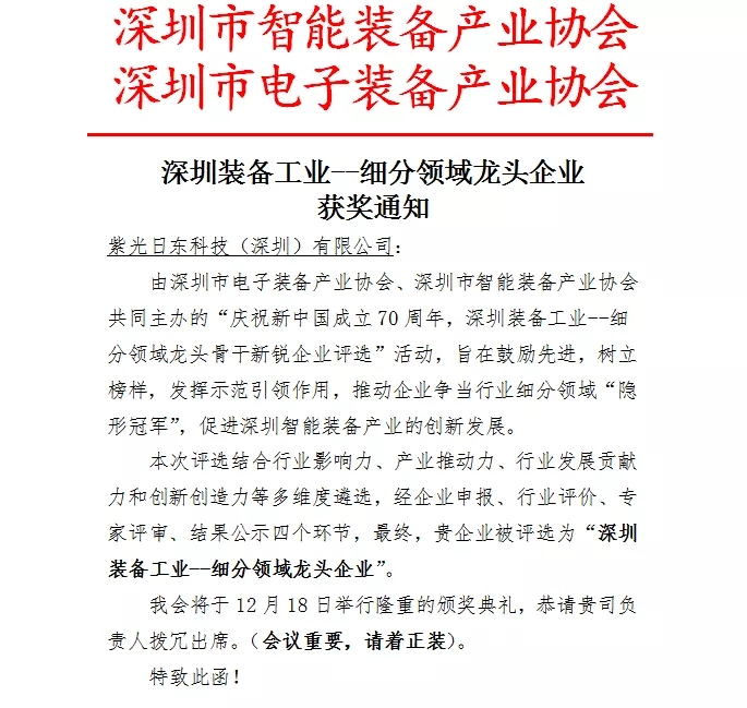 2019年12月18日,由深圳市電子裝備產(chǎn)業(yè)協(xié)會、深圳市智能裝備產(chǎn)業(yè)協(xié)會主辦的“深圳裝備工業(yè)—細(xì)分領(lǐng)域龍頭骨干新銳企業(yè)”評選活動,在深圳市福田區(qū)會展中心舉行盛大的頒獎典禮,經(jīng)過組委會的層層篩選,日東科技在本次評選中獲得了細(xì)分領(lǐng)域”龍頭企業(yè)“的殊榮!