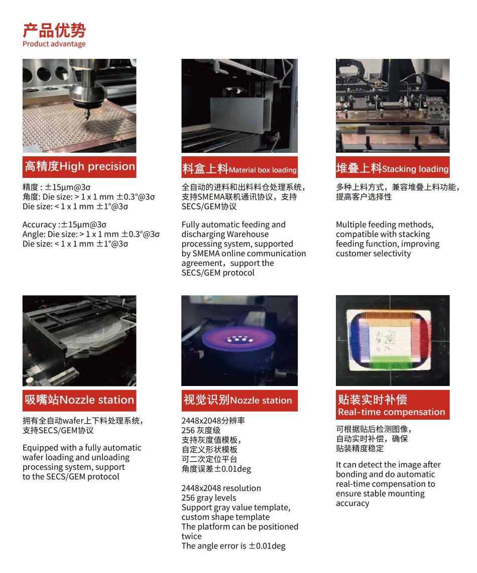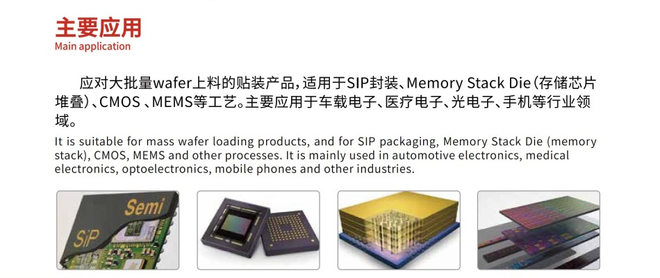 通用型高精度芯片貼合機,應對大批量wafer上料的貼裝產品,適用于SIP封裝、Memory Stack Die(存儲芯片堆疊)、CMOS 、MEMS等工藝。