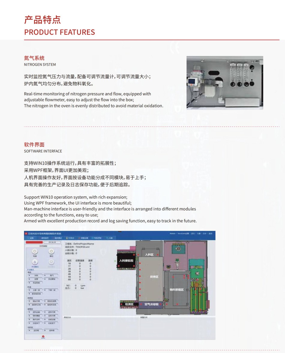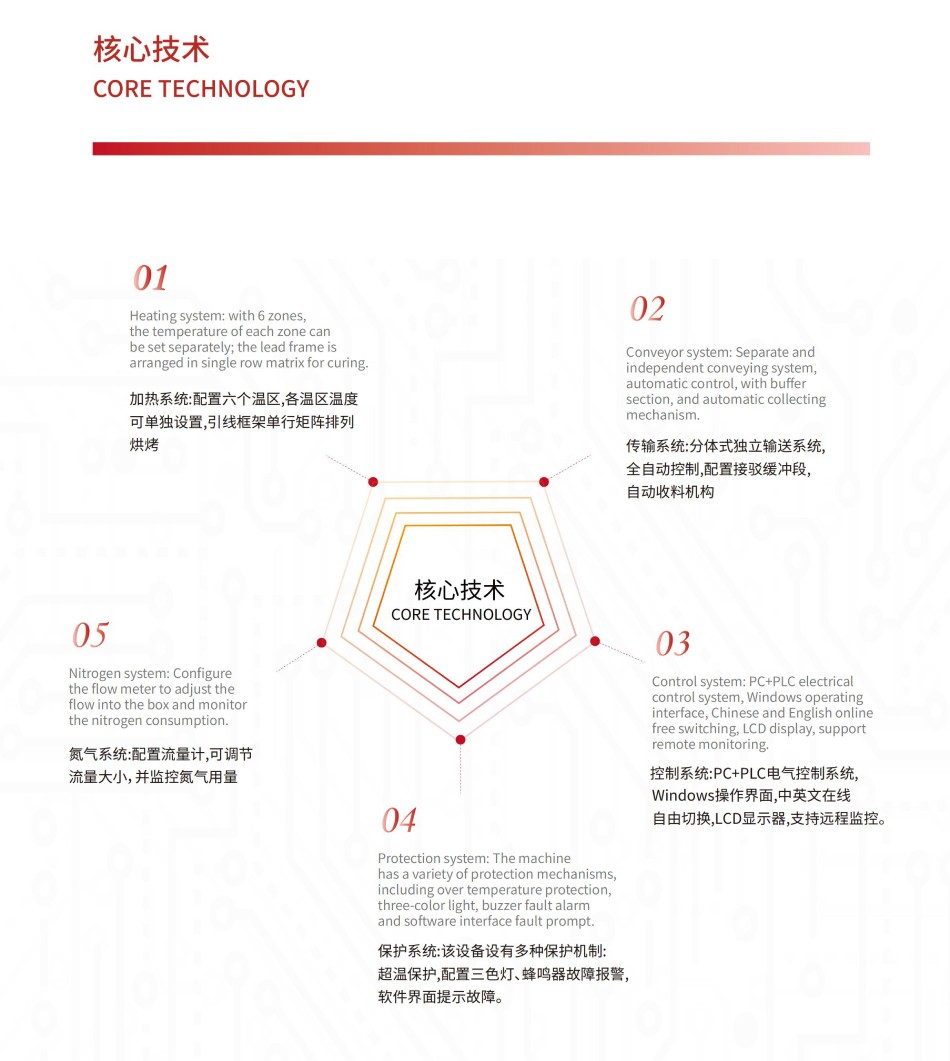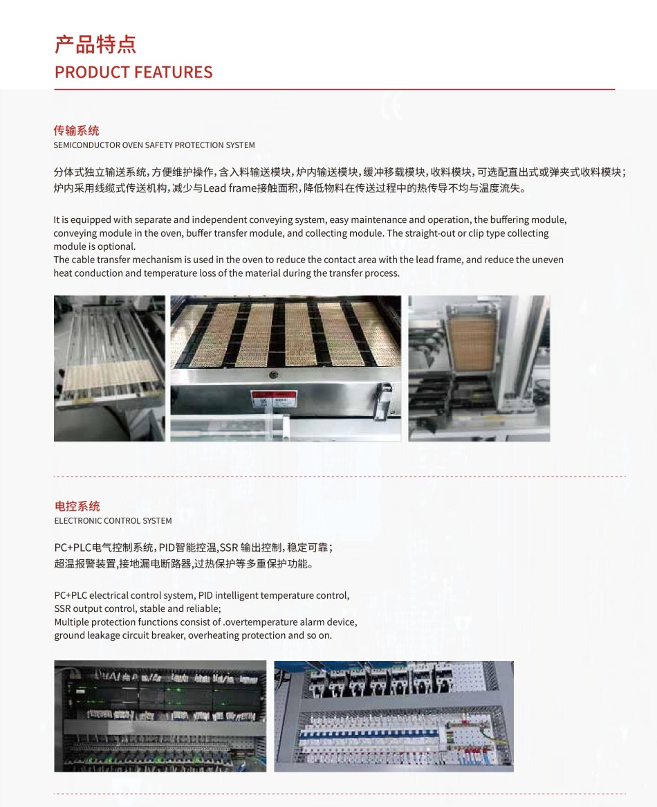 加熱系統(tǒng):配置六個(gè)溫區(qū),各溫區(qū)溫度可單獨(dú)設(shè)置,引線框架單行矩陣排列烘烤。