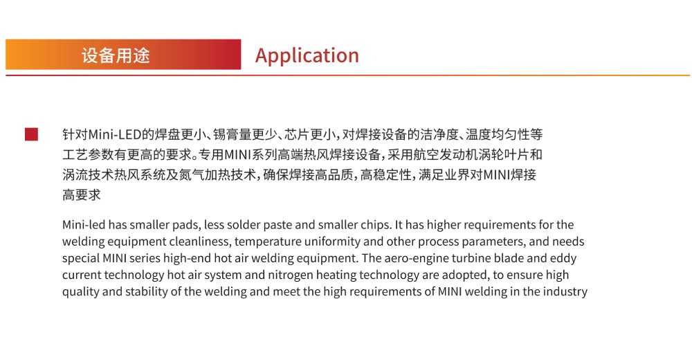 針對Mini-LED的焊盤更小、錫膏量更少、芯片更小,對焊接設備的潔凈度、溫度均勻性等工藝參數有更高的要求。專用MINI系列高端熱風焊接設備,采用航空發動機渦輪葉片和渦流技術熱風系統及氮氣加熱技術,確保焊接高品質,高穩定性,滿足業界對MINI焊接的高要求。